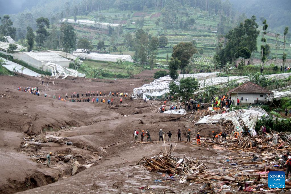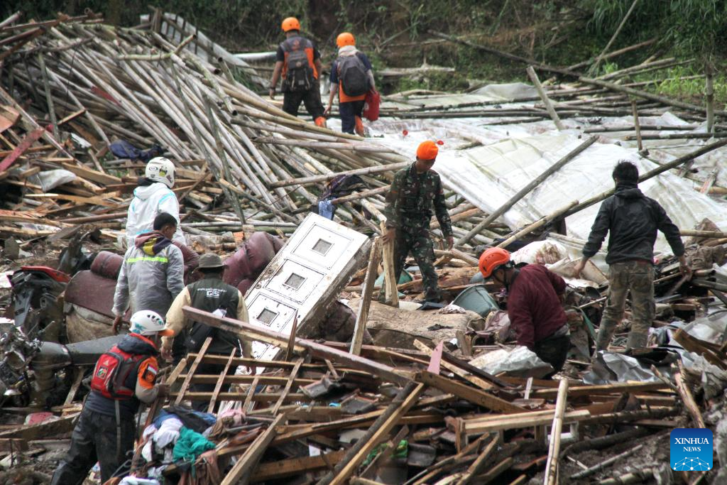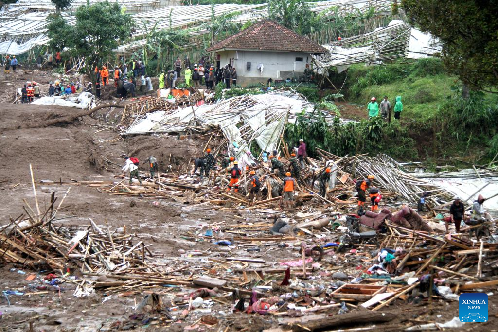 Rescue team members work on site during search operations after a landslide accompanied by flash floods struck Cisarua Sub-district in West Bandung Regency, West Java, Indonesia, Jan. 24, 2026. (Photo by Septianjar Muharam/Xinhua)