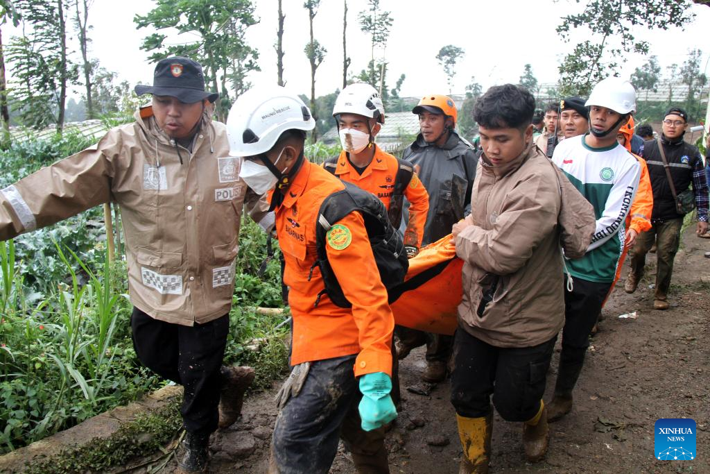 Rescue team members transfer body of a victim during search operations after a landslide accompanied by flash floods struck Cisarua Sub-district in West Bandung Regency, West Java, Indonesia, Jan. 24, 2026. (Photo by Septianjar Muharam/Xinhua)