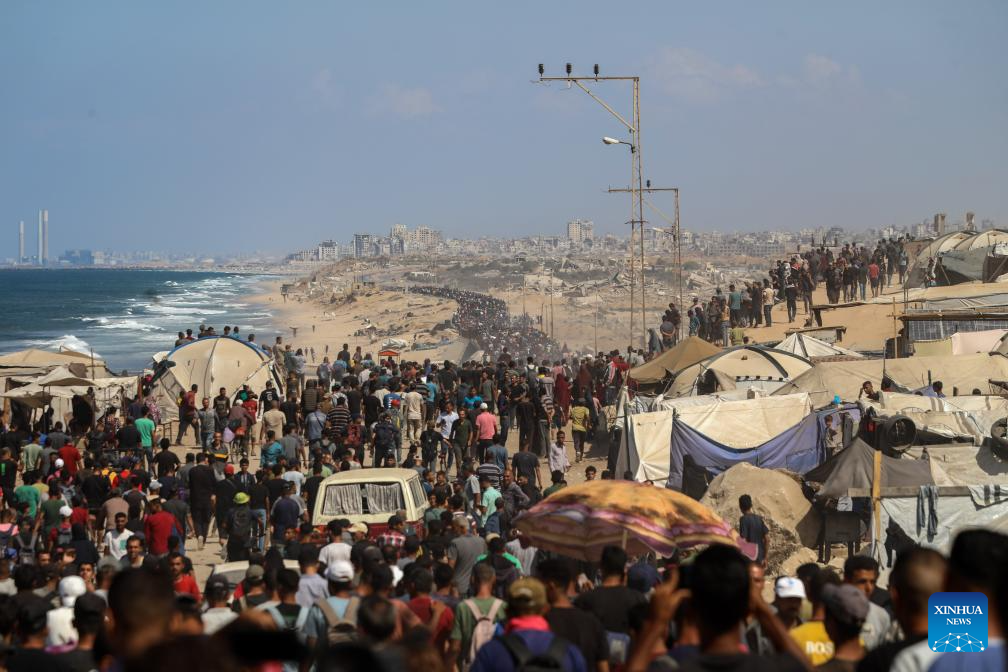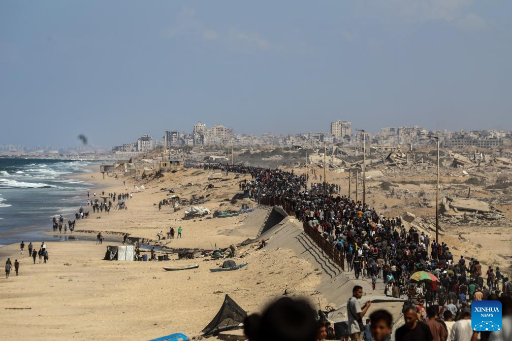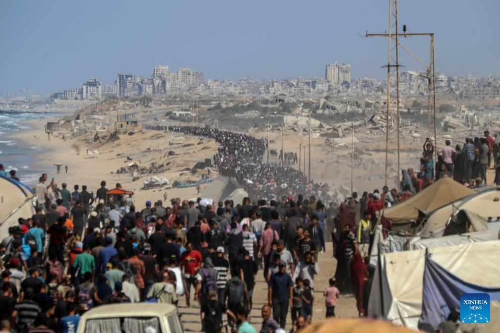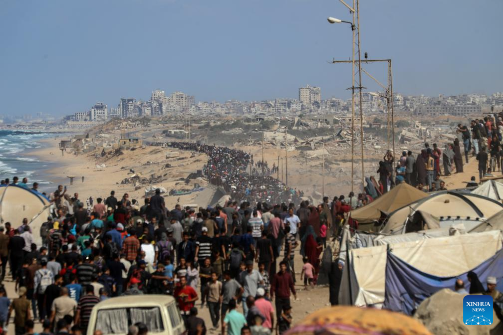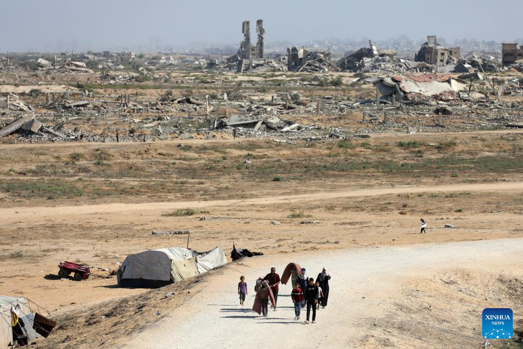 Palestinians walk on road returning to Gaza City, near the central Gaza Strip, on Oct. 10, 2025. Displaced Palestinians have begun returning from the southern part of the Gaza Strip to the north after the Israeli army announced that civilians are permitted to move through the coastal Rashid Road and Salah al-Din Road, local sources said on Friday. (Photo by Rizek Abdeljawad/Xinhua)