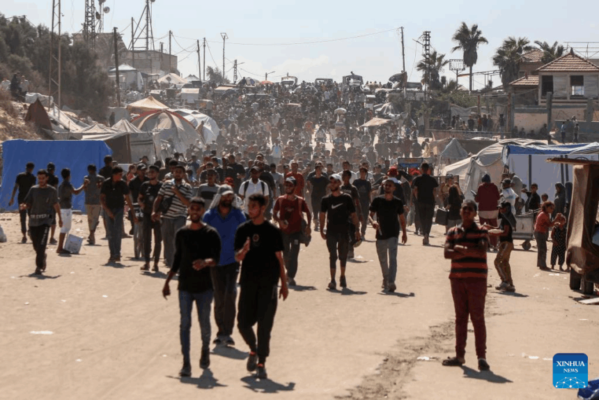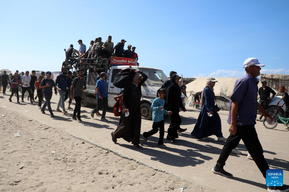 Palestinians move on road near the central Gaza Strip returning to Gaza City, Oct. 10, 2025. Displaced Palestinians have begun returning from the southern part of the Gaza Strip to the north after the Israeli army announced that civilians are permitted to move through the coastal Rashid Road and Salah al-Din Road, local sources said on Friday. (Photo by Rizek Abdeljawad/Xinhua)