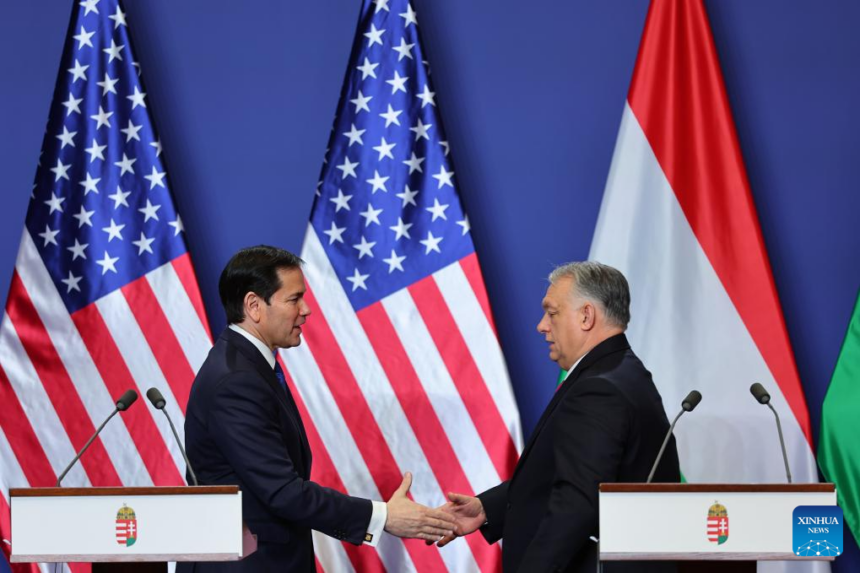 Hungarian Prime Minister Viktor Orban (R) and U.S. Secretary of State Marco Rubio attend a joint press conference in Budapest, Hungary on Feb. 16, 2026. Hungary and the United States signed a civil nuclear energy cooperation agreement on Monday during a visit by U.S. Secretary of State Marco Rubio to Budapest. (Photo by David Balogh/Xinhua)