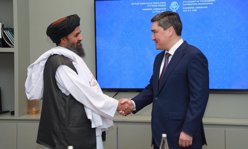 Mullah Abdul Ghani Baradar, Deputy Prime Minister for Economic Affairs, met on Friday with the Prime Minister of Kazakhstan Olzhas Bektenov in Khankendi, Azerbaijan, where both sides discussed political, economic, and trade issues between Afghanistan and Kazakhstan, the Afghan deputy PM’s office said in a statement.
