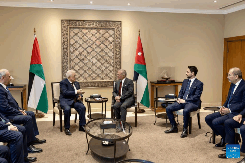 Jordan’s King Abdullah II (R) shakes hands with visiting Palestinian President Mahmoud Abbas in Amman, Jordan, Sept. 10, 2025. During his meeting with Abbas on Wednesday, King Abdullah II condemned the Israeli Doha strike, rejected Israeli plans to expand control over Gaza and settlement activity in the West Bank, stressed the need for a ceasefire in Gaza and unhindered humanitarian access, and for implementing the two-state solution, according to a Royal Court statement. (Royal Hashemite Court/Handout via Xinhua)