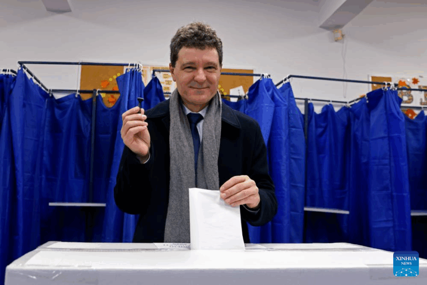 Romanian President Nicusor Dan votes during a local election at a polling station in Bucharest, Romania, on Dec. 7, 2025. Bucharest’s citizens on Sunday vote in a local mayoral election after the former mayor Nicusor Dan was elected as Romanian president in May. (Photo by Cristian Cristel/Xinhua)