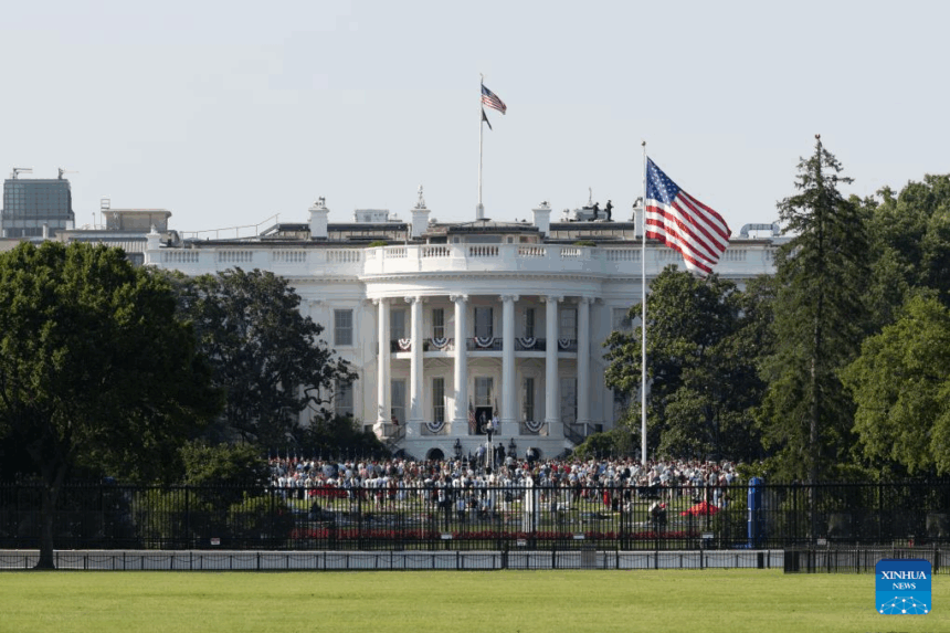 U.S. President Donald Trump speaks on the balcony of the White House in Washington, D.C., the United States, on July 4, 2025. Trump signed his landmark policy bill, the One Big Beautiful Bill, into law on Friday afternoon. (Xinhua/Hu Yousong)