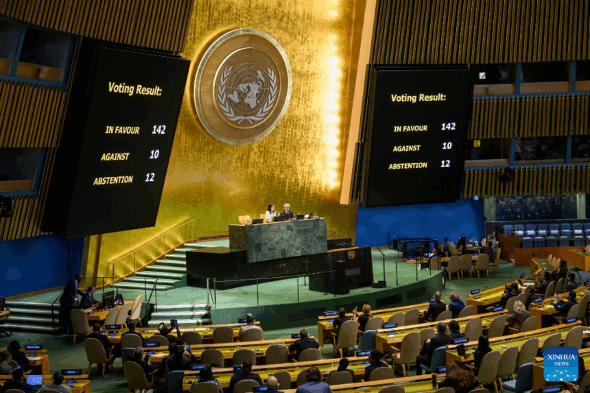 The UN General Assembly (UNGA) on Friday adopted a draft resolution endorsing the New York Declaration on the Peaceful Settlement of the Question of Palestine and the Implementation of the Two-State Solution.